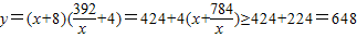 學(xué)校要建一個面積為392 m2的長方形游泳池,并且在四周要修建出寬為2 m和4 m的小路(如圖所示).問游泳池的長和寬分別為多少米時,占地面積最。坎⑶蟪稣嫉孛娣e的最小值.
