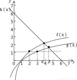 【答案】分析:已知方程x+log2x=6的根為α,方程x+log3x=6的根為β,可以令f(x)=log2x,g(x)=log3x,h(x)=6-x,利用數(shù)形結(jié)合法進(jìn)行求解;
