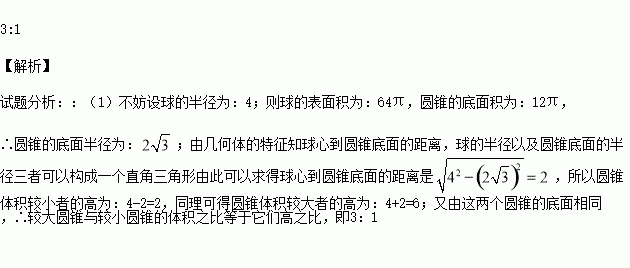 一個透明的球形裝飾品內(nèi)放置了兩個公共底面的圓錐如右圖,且這兩個圓錐的頂點和底面圓周都在這個球面上,如圖,已知圓錐底面面積是這個球面面積的