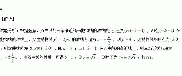 的焦點的距離為4,且雙曲線一條漸近線與拋物線準線的交點坐標為(-2,-1),則雙曲線的焦距為( )