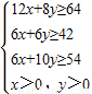 某營養(yǎng)師要求為某個(gè)兒童預(yù)訂午餐和晚餐.已知一個(gè)單位的午餐含12個(gè)單位的碳水化合物,6個(gè)單位的蛋白質(zhì)和6個(gè)單位的維生素C;一個(gè)單位的晚餐含8個(gè)單位的碳水化合物,6個(gè)單位的蛋白質(zhì)和10個(gè)單位的維生素C.另外,該兒童這兩餐需要的營狀中至少含64個(gè)單位的碳水化合物和42個(gè)單位的蛋白質(zhì)和54個(gè)單位的維生素C.