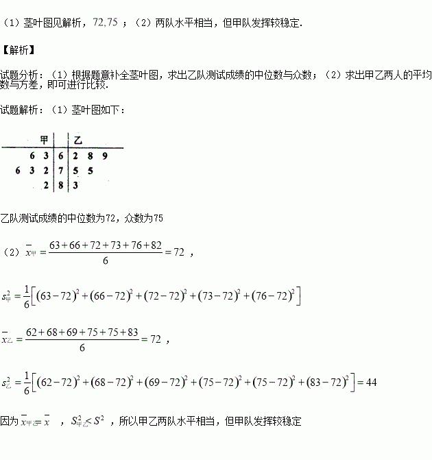 (1)在答題卡上補(bǔ)全莖葉圖并指出乙隊測試成績的中位數(shù)和眾數(shù);