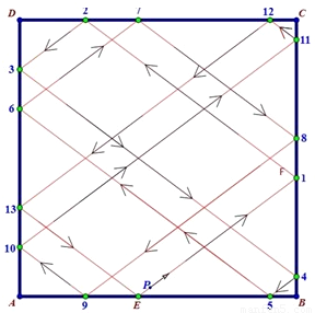 解答:解:根據(jù)已知中的點E,F(xiàn)的位置,可知第一次碰撞點為F,在反射的過程中,直線是平行的,利用平行關系及三角形的相似可得第二次碰撞點為G,且CG=,第二次碰撞點為H,且DH=,作圖,