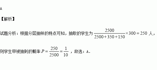 某學(xué)校有學(xué)生2500人,教師350人,后勤職工150人,為了調(diào)查對食堂服務(wù)的滿意度,用分層抽樣從中抽取300人,則學(xué)生甲被抽到的概率為( )