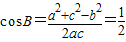 【答案】分析:(1)利用題設(shè)等式和余弦定理求得cosB的值,進(jìn)而求得B.
