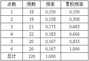連續(xù)拋擲一枚骰子120次,得到1、2、3、4、5、6點的次數(shù)各為18、19、21、22、20、20.
