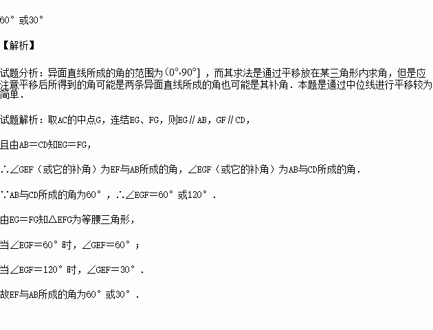 (10分)空間四邊形ABCD中,AB=CD且AB與CD所成的角為60°,E、F分別是BC、AD的中點,求EF與AB所成角的大。