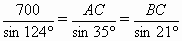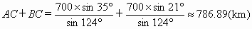 A地飛往B地,兩地相距700km.飛行員為了避開某一區(qū)域的雷雨云層,從機(jī)場起飛以后,就沿與原來的飛行方向成21°角的方向飛行,飛行到中途,再沿與原來的飛行方向成35°角的方向繼續(xù)飛行直到終點(diǎn).這樣飛機(jī)的飛行路程比原來的路程700km遠(yuǎn)了多少?![]()