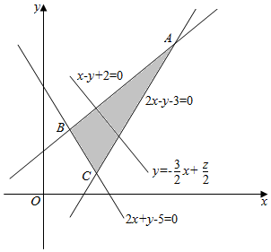 由圖形可知當(dāng)直線y=-$\frac{3}{2}x$+$\frac{z}{2}$過點(diǎn)A時(shí),截距最大,即z最大.