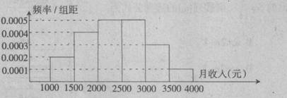 一個(gè)社會調(diào)查機(jī)構(gòu)就某地居民的月收入調(diào)查了10000人,并根據(jù)所得數(shù)據(jù)畫了樣本的頻率分布直方圖(如下圖),為了分析居民的收入與年齡、學(xué)歷、職業(yè)等方面的關(guān)系,要從這10000人中再用分層抽樣方法抽出200人作進(jìn)一步調(diào)查,其中低于1500元的稱為低收入者,高于3000元的稱為高收入者,則應(yīng)在低收入者和高收入者中分別抽取的人數(shù)是( )