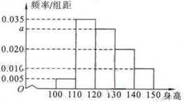 從某小學(xué)隨機(jī)抽取100名同學(xué),將他們的身高(單位:厘米)數(shù)據(jù)繪制成頻率分布直方圖(如圖)。由圖中數(shù)據(jù)可知a=