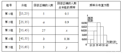 某市電視臺(tái)為了宣傳舉辦問(wèn)答活動(dòng),隨機(jī)對(duì)該市15~65歲的人群抽樣了n人,回答問(wèn)題計(jì)結(jié)果如下圖表所示: