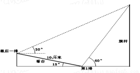 福州青運會開幕式上舉行升旗儀式,在坡度15°的看臺上,同一列上的第一排和最后一排測得旗桿頂部的仰角分別為60°和30°,第一排和最后一排的距離為