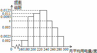 (2)在月平均用電量為[220.240),[240,260),[260,280),[280,300)的四組用戶中,用分層抽樣的方法抽取11戶居民,則月平均用電量在[240.260)的用戶中應抽取多少戶?