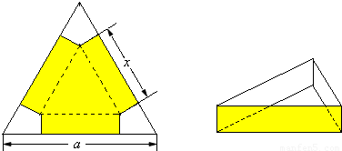 在邊長為a的正三角形鐵皮的三個角切去三個全等的四邊形,再把它的邊沿虛線折起(如圖),做成一個無蓋的正三角形底鐵皮箱,當箱底邊長為多少時,箱子容積最大?最大容積是多少?