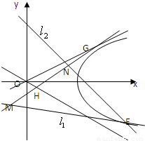 2y=4的交點(diǎn)E在雙曲線C上,直線MN與兩條漸近線分別交與G、H兩點(diǎn),求△OGH的面積.