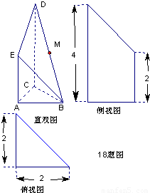 如圖是某直三棱柱(側(cè)棱與底面垂直)被削去上底后的直觀圖與三視圖的側(cè)視圖、俯視圖.在直觀圖中,M是BD的中點(diǎn).側(cè)視圖是直角梯形,俯視圖是等腰直角三角形,有關(guān)數(shù)據(jù)如圖所示.