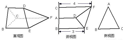 如圖是某三棱柱被削去一個底面后的直觀圖與側(cè)視圖、俯視圖.已知CF=2AD,側(cè)視圖是邊長為2的等邊三角形;俯視圖是直角梯形,有關(guān)數(shù)據(jù)如圖所示.