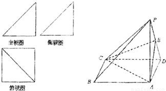 一個簡單多面體的直觀圖和三視圖如圖所示,它的主視圖和側(cè)視圖都是腰長為1的等腰直角三角形,俯視圖為正方形,E是PD的中點.