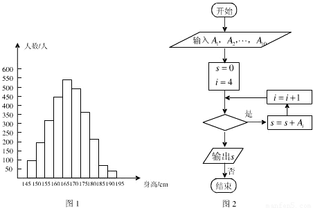 2表示身高(單位:cm)在[150,155)內(nèi)的學生人數(shù))圖2是統(tǒng)計圖1中身高在一定范圍內(nèi)學生人數(shù)的一個算法流程圖.現(xiàn)要統(tǒng)計身高在160~180cm(含160cm,不含180cm)的學生人數(shù),那么在流程圖中的判斷框內(nèi)應(yīng)填寫的條件是( )