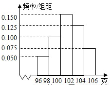 某工廠對(duì)一批產(chǎn)品進(jìn)行了抽樣檢測.右圖是根據(jù)抽樣檢測后的產(chǎn)品凈重(單位:克)數(shù)據(jù)繪制的頻率分布直方圖,其中產(chǎn)品凈重的范圍是[96,106],樣本數(shù)據(jù)分組為[96,98),[98,100),[100,102),[102,104),[104,106],已知樣本中產(chǎn)品凈重小于100克的個(gè)數(shù)是36,則樣本中凈重大于或等于98克的產(chǎn)品的個(gè)數(shù)是( )