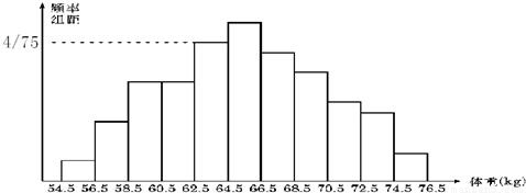 為了了解某地區(qū)高三學生的身體發(fā)育情況,抽查了該地區(qū)若干年齡在17歲-18歲的男生的體重(kg),得到了如下頻率分布直方圖.已知體重在[62.5,64.5]內(nèi)的男生為8人,則所抽取的樣本容量為( )