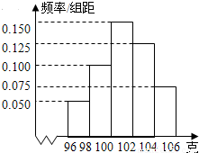 某工廠對一批產(chǎn)品進(jìn)行了抽樣檢測.如圖是根據(jù)抽樣檢測后的產(chǎn)品凈重(單位:克)數(shù)據(jù)繪制的頻率分布直方圖,其中產(chǎn)品凈重的范圍是[96,106],樣本數(shù)據(jù)分組為[96,98),[98,100),[100,102),[102,104),[104,106],已知樣本中產(chǎn)品凈重小于100克的個數(shù)是36,則樣本中凈重大于或等于98克并且小于104克的產(chǎn)品的個數(shù)是( )