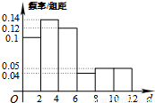 某公司為改善職工的出行條件,隨機(jī)抽取50名職工,調(diào)查他們的居住地與公司的距離d(單位:千米).若樣本數(shù)據(jù)分組為[0,2],(2,4],(4,6],(6,8],(8,10],(10,12],由數(shù)據(jù)繪制的分布頻率直方圖如圖所示,則樣本中職工居住地與公司的距離不超過4千米的人數(shù)為