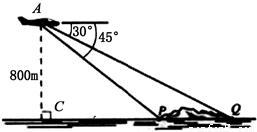 第四屆中國國際航空航天博覽會于2010年11月在珠海舉行,一次飛行表演中,一架直升飛機在海拔800m的高度飛行,從空中A處測出前下方海島兩側(cè)海岸P、Q處的俯角分別是45°和30°(如圖所示).