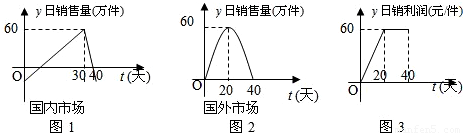 某公司是一家專做產(chǎn)品A的國內(nèi)外銷售的企業(yè),每一批產(chǎn)品A上市銷售40天全部售完,該公司對第一批產(chǎn)品A上市后的國內(nèi)外市場的銷售情況進(jìn)行了跟蹤調(diào)查,調(diào)查結(jié)果如圖1、圖2、圖3所示,其中圖1中的折線表示的是國內(nèi)市場的日銷售量與上市時間的關(guān)系;圖2中的拋物線表示國外市場的日銷售量與上市時間的關(guān)系;圖3中的折線表示的是每件產(chǎn)品A的銷售利潤與上市時間的關(guān)系(國內(nèi)外市場相同)