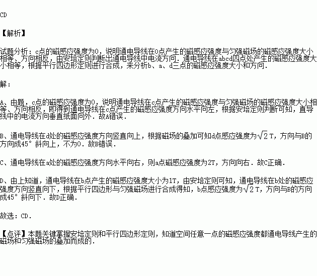 如圖所示,一根通電直導線垂直放在磁感應強度為1T的勻強磁場中,以導線為中心,半徑為R的圓周上有a、b、c、d四個點,已知c點的實際磁感應強度為0,則下列說法中正確的是( )
