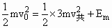 (16分)解:(1)當(dāng)A球與彈簧接觸以后,在彈力作用下減速運動,而B球在彈力作用下加速運動,彈簧勢能增加,當(dāng)A、B速度相同時,彈簧的勢能最大. 設(shè)A、B的共同速度為v,彈簧的最大勢能為E,則A、B系統(tǒng)動量守恒,有mv0=(m+2m)v (1分) 由機械能守恒mv02/2=(m+2m)v2/2+E (2分) 聯(lián)立兩式得E=mv02/3 (1分) (2)設(shè)B球與擋板碰撞前瞬間的速度為vB,此時A的速度為vA 系統(tǒng)動量守恒mv0=mvA+2mvB (1分) B與擋板碰后,以vB向左運動,壓縮彈簧,當(dāng)A、B速度相同(設(shè)為v共)時,彈簧勢能最大,有: ∴ 又 所以 當(dāng)彈簧恢復(fù)原長時與小球B擋板相碰,vB有最大值 解得 即vB的取值范圍為0<VB≤2v0/3 (1分) 當(dāng)vB=v0/4時Em有最大值為Em1=mv02/2 (1分) 當(dāng)vB=2v0/3時,Em有最小值為Em2=mv02/27 (1分) 所以,mv02/27≤Em≤mv02/2 (1分) |