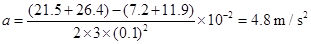 ②4.8 m/s2,乙,加速度比重力加速度小。