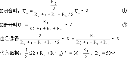 正確解答:解法一:設(shè)所求阻值 當(dāng)K閉合時(shí),ε1=UL+I(xiàn)1(R1+r+R2) 當(dāng)K斷開時(shí),ε2=UL+I(xiàn)2(R1+r+ 又∵ε1=ε2=ε I1=2I2=2I,(I為額定電流) 得ε=UL+2I(R1+r+R2)、 ε=UL+I(xiàn)(R1+r+ 、伲贗(R1+r+2R2- ∴R1+r+2R2= 解法二:設(shè)所求阻值 小結(jié):電路中的局部電路(開關(guān)的通斷、變阻器的阻值變化等)發(fā)生變化必然會(huì)引起干路電流的變化,進(jìn)而引起局部電流電壓的變化.應(yīng)當(dāng)牢記當(dāng)電路發(fā)生變化后要對電路重新進(jìn)行分析 |