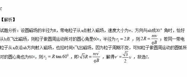 如圖所示,在圓形區(qū)域內(nèi)存在垂直紙面向外的勻強磁場,ab是圓的直徑.一帶電粒子從a點射入磁場,速度大小為v、方向與ab成30°角時,恰好從b點飛出磁場,且粒子在磁場中運動的時間為t;若同一帶電粒子從a點沿ab方向射入磁場,也經(jīng)時間t飛出磁場,則其速度大小為( )