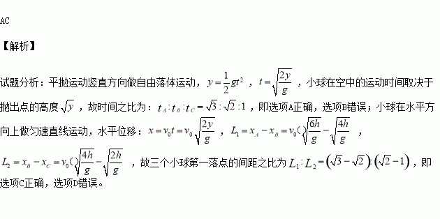 A.三個小球平拋至落地的時間之比為![]()