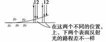 中光線(xiàn)1和2反射回來(lái)的光線(xiàn)干涉后形成亮條紋.它們對(duì)應(yīng)的空氣厚度差應(yīng)為λ/2,若選用彎曲程度較大的凸透鏡,空氣厚度差為λ/2的點(diǎn)的間距將變密,即亮條紋間距將變密,牛頓環(huán)的直徑變小,故應(yīng)選用彎曲程度較小的凸透鏡.