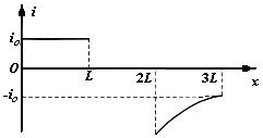線圈的整個(gè)運(yùn)動(dòng)情況如圖中所示,可分為三個(gè)階段I→Ⅱ,Ⅱ→Ⅲ,Ⅲ→Ⅳ. 在Ⅰ→Ⅱ的過(guò)程中,由于線圈勻速進(jìn)入磁場(chǎng),據(jù)E=BLv和I= 在Ⅱ→Ⅲ的過(guò)程中,線圈中磁通量不變,所以線圈中無(wú)感應(yīng)電流,此過(guò)程中,線圈做勻加速運(yùn)動(dòng). 當(dāng)線圈從Ⅲ位置再向右運(yùn)動(dòng)時(shí),由于此時(shí)的速度值大于線圈進(jìn)入磁場(chǎng)時(shí)的速度,因而線圈中產(chǎn)生的感應(yīng)電流值i>i0,并且是順時(shí)針?lè)较虻,此時(shí)線圈受到的向左的安培力大于向右的恒力,故線圈做減速運(yùn)動(dòng),因而電流也同步減。(dāng)線圈離開(kāi)磁場(chǎng)時(shí),其速度必大于或等于進(jìn)入磁場(chǎng)時(shí)的速度(因?yàn)槿魷p小到原來(lái)的速度,線框又將受力平衡而做勻速運(yùn)動(dòng)),因此對(duì)應(yīng)的感應(yīng)電流必然有i³i0. 綜合上述三個(gè)過(guò)程的分析可得,線圈中的感應(yīng)電流i隨線圈的位移x的變化圖線如上圖所示.