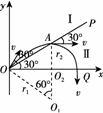 粒子在兩區(qū)域中運(yùn)動(dòng)的軌跡如圖所示,由幾何關(guān)系可知,質(zhì)子從A點(diǎn)出勻強(qiáng)磁場(chǎng)區(qū)域Ⅰ時(shí)的速度方向與OP的夾角為30°,故質(zhì)子在勻強(qiáng)磁場(chǎng)區(qū)域Ⅰ中運(yùn)動(dòng)軌跡對(duì)應(yīng)的圓心角為θ=60°,則△O1OA為等邊三角形