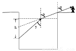有一條河寬5m,河堤高出水面1m,有人在離河岸4m、高2m處恰能看到對岸水面下的小動物,求小動物在水面下的深度。(水的折射率為4/3,要求做出光路圖,最后結果可用根號表示)。
