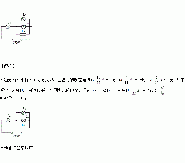 有三盞電燈L1、L2、L3,規(guī)格分別是“110V 100W”、“110V 40W”、“110V 25W”,要求接到電壓是220V的電源上,使每盞燈都能正常發(fā)光,可以使用一只適當(dāng)規(guī)格的電阻,應(yīng)如何連接電路?
