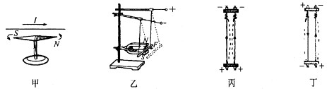 D.丁圖中,當電流方向相反時,導線相互遠離