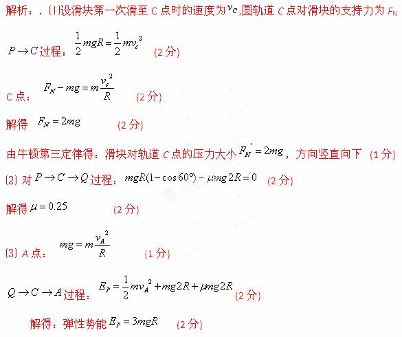 Q點,并能觸發(fā)彈簧解除鎖定,然后滑塊被彈回,且剛好能通過圓軌道的最高點A。已知∠POC=60°,求: