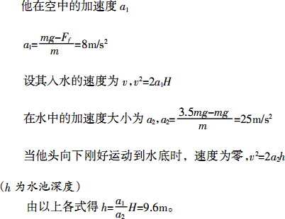 30 m高的塔上跳下準(zhǔn)確地落入水池中,若已知水對他的阻力(包括浮力)是他重力的3.5倍,他在空中時(shí)空氣對他的阻力是他重力的0.2倍,則這需要準(zhǔn)備一個(gè)至少深度為________m的水池.(g取10 m/s2)
