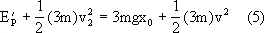 解:物塊從3x0位置自由落下,與地球構(gòu)成的系統(tǒng)機械能守恒.則有 v0為物塊與鋼板碰撞時的的速度.因為碰撞板短,內(nèi)力遠大于外力,鋼板與物塊間動量守恒.設(shè)v1為兩者碰撞后共同速 mv0=2mv1 (2) 兩者以vl向下運動恰返回O點,說明此位置速度為零.運動過程中機械能守恒.設(shè)接觸位置彈性勢能為Ep,則 同理2 m物塊與m物塊有相同的物理過程 碰撞中動量守恒2mv0=3mv2 (4) 所不同2 m與鋼板碰撞返回O點速度不為零,設(shè)為v則 因為兩次碰撞時間極短,彈性形變未發(fā)生變化 Ep= 由于2 m物塊與鋼板過O點時彈力為零.兩者加速度相同為g,之后鋼板被彈簧牽制,則其加速度大于g,所以與物塊分離,物塊以v豎直上拋. |