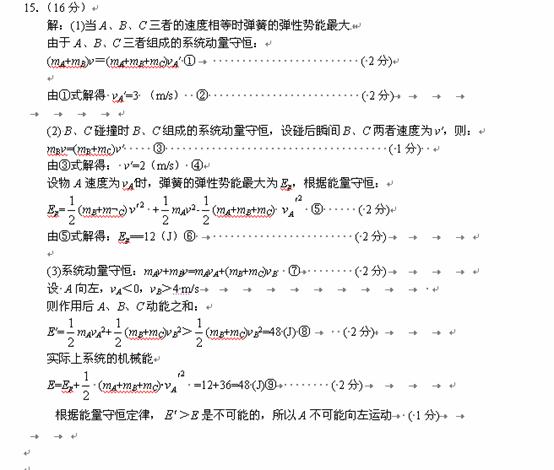 的速度在光滑水平地面上運(yùn)動(dòng),彈簧處于原長(zhǎng),質(zhì)量4 kg的物塊C靜止在前方,B與C碰撞后二者粘在一起運(yùn)動(dòng)。在以后的運(yùn)動(dòng)中,求: