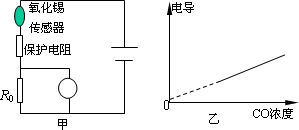 氧化錫傳感器主要用于汽車尾氣中一氧化碳濃度的檢測(cè),它的電阻隨一氧化碳濃度的變化而變化.在如圖甲所示的電路中,不同的一氧化碳濃度對(duì)應(yīng)著傳感器的不同電阻,這樣,電壓表的指針位置就與一氧化碳濃度有了對(duì)應(yīng)關(guān)系,觀察電壓表指針就能判斷一氧化碳濃度是否超標(biāo).有一種氧化錫傳感器,其技術(shù)資料中給出的是電導(dǎo)(即電阻的倒數(shù))一CO濃度曲線,如圖乙所示.在下列表示一氧化碳濃度c與電壓表示數(shù)U0之間關(guān)系的圖象中正確的是