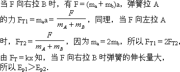 如圖所示,在光滑水平面上有A、B兩物體,中間連一彈簧,已知ma=2mb,今用水平恒力F向右拉B,當(dāng)A、B一起向右加速運(yùn)動(dòng)時(shí),彈簧的彈性勢(shì)能為Ep1,如果水平恒力F向左拉A,當(dāng)A、B一起向左加速運(yùn)動(dòng)時(shí),彈簧的彈性勢(shì)能為Ep2,則Ep1________Ep2.