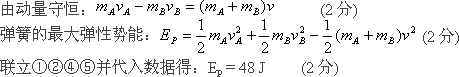 (1)釋放后,在彈簧恢復(fù)原長(zhǎng)的過(guò)程中B和C和一起向左運(yùn)動(dòng),當(dāng)彈簧恢復(fù)原長(zhǎng)后B和C的分離,所以此過(guò)程B對(duì)C做功. 選取A、B、C為一個(gè)系統(tǒng),在彈簧恢復(fù)原長(zhǎng)的過(guò)程中動(dòng)量守恒(取向右為正向): (2)B和C分離后,選取A、B為一個(gè)系統(tǒng),當(dāng)彈簧被壓縮至最短時(shí),彈簧的彈性勢(shì)能最大,此時(shí)A、B具有共同速度v,取向右為正向 |