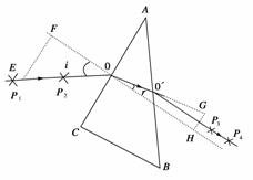 用三棱鏡做測定玻璃的折射率,先在白紙上放好三棱鏡,在棱鏡的一側(cè)插上兩枚大頭針P1和P2,然后,在棱鏡的另一側(cè)觀察,調(diào)整視線使P1的像被P2擋住;接著在眼睛所在的一側(cè)再插兩枚大頭針P3和P4,使P3擋住P2、P1的像,P4擋住P3和P1、P2的像,在紙上已標(biāo)明大頭針的位置和三棱鏡的輪廓,如圖所示。